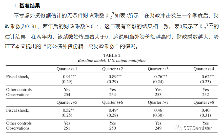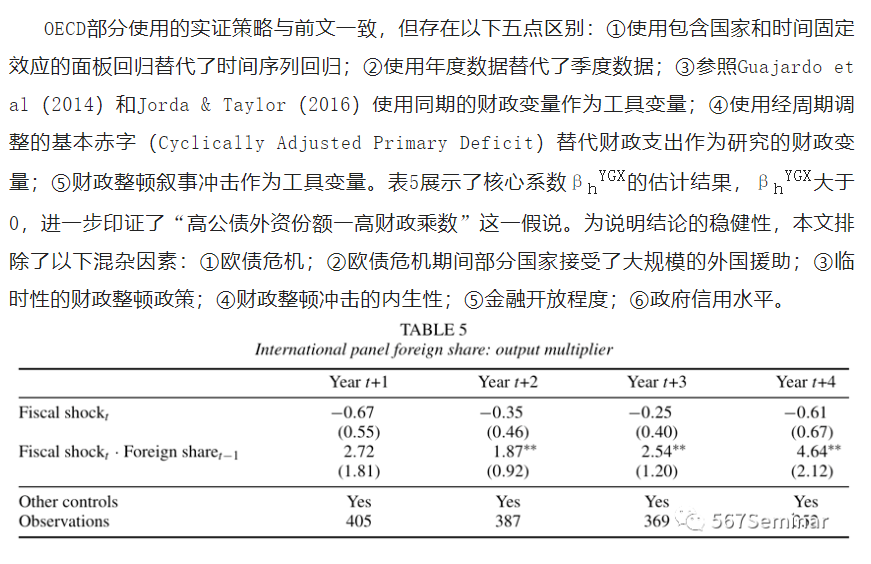 为了弥补文献中的不足,本文使用美国二战后的季度数据和经合组织(OECD)17国近四十年的年度数据,采用两阶段最小二乘法(Two Stage Least Square,2SLS),研究了公债外资份额对财政乘数的影响,验证了“高公债外资份额-高财政乘数”这一假说。具体而言,作者研究发现:①在20世纪50年代,美国公债中的外资份额低于5%,此时美国的财政支出乘数小于1;而在当下,美债中的外资份额接近50%,财政支出乘数高于1;②“高公债外资份额-高财政乘数”在OECD样本中同样成立。其中,日本公债的外资份额约为8%,财政乘数小于1;爱尔兰的公债外资份额高达64%,财政乘数大于1。