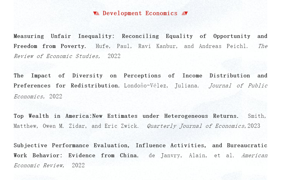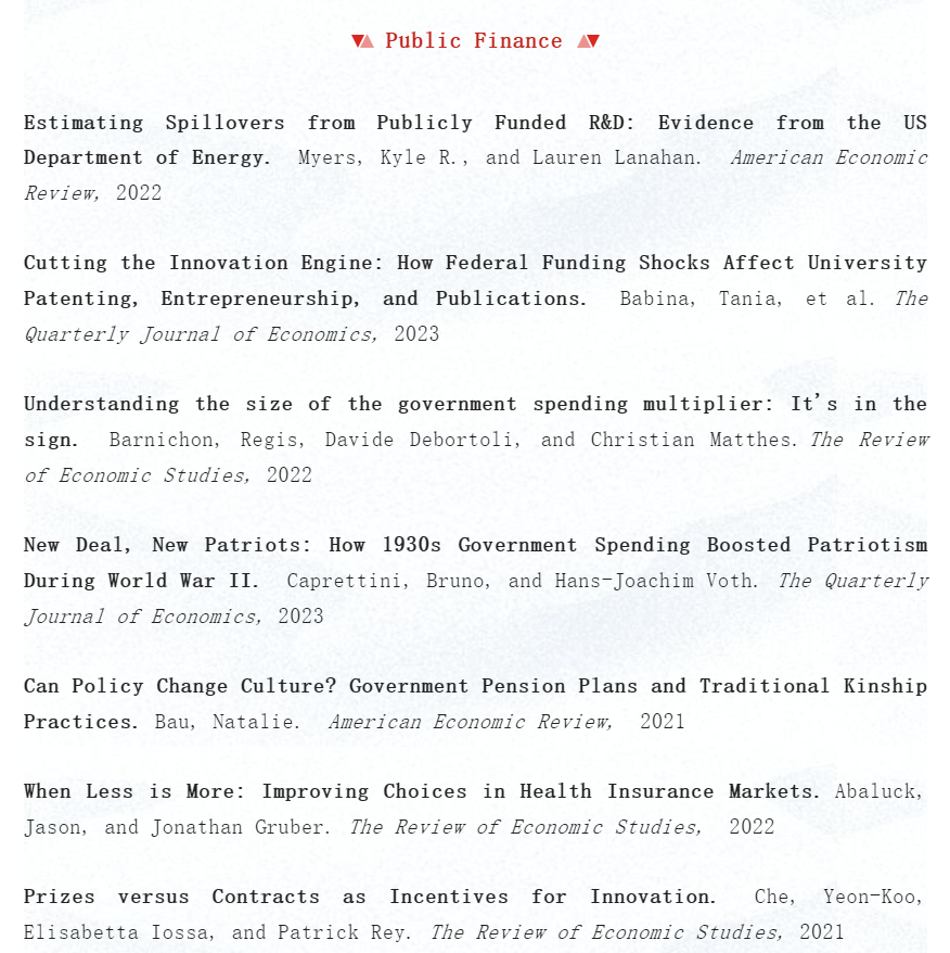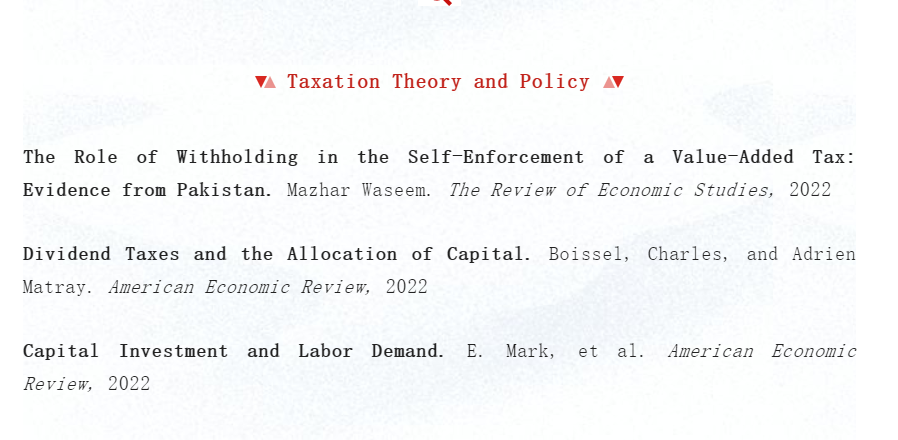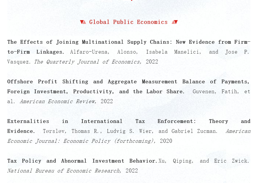 新的学期开始啦,567 Seminar的文献研讨和推送活动如期而至!本学期前沿文献选自AER、QJE、JPubE、RES以及NBER等国际顶级学术期刊和组织,涵盖了财税理论与政策、全球公共经济学等热点话题。研读文献列表如下,期待与各位老师、同学一起碰撞学习、交流和进步,也诚挚邀请各位读者积极留言互动!