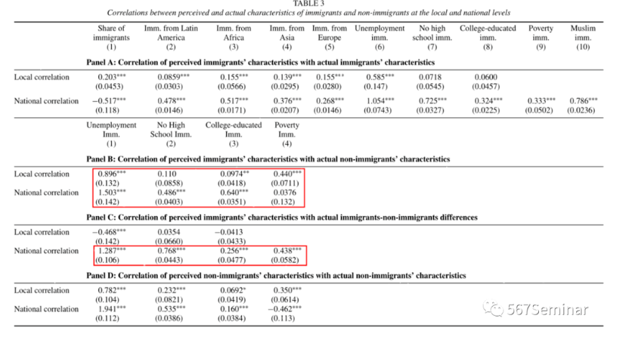 对移民误解的一个可能来源是接触某一特定现象较多的人可能夸大该现象的实际频率和普遍程度。数据表明,对全国移民比例的误解与当地移民比例呈正相关,在日常生活中更容易接触到移民的受访者,更倾向于夸大移民的比例。受访者感知的移民文化和经济特征与其所在国家和地区的移民真实特征也呈现显著正相关(表3 panel A)。另外,表3还显示,受访者将非移民的特征作为“锚点”,从非移民的特征推断移民的特征,过度强调两者之间的差异。比如,在非移民失业率较高的地区或国家,受访者也往往认为移民的失业人数较多。