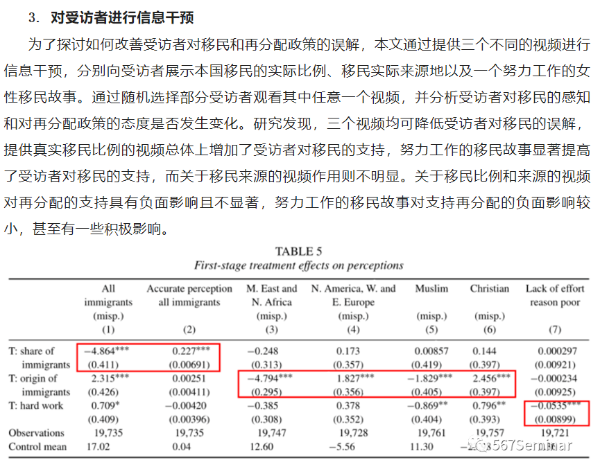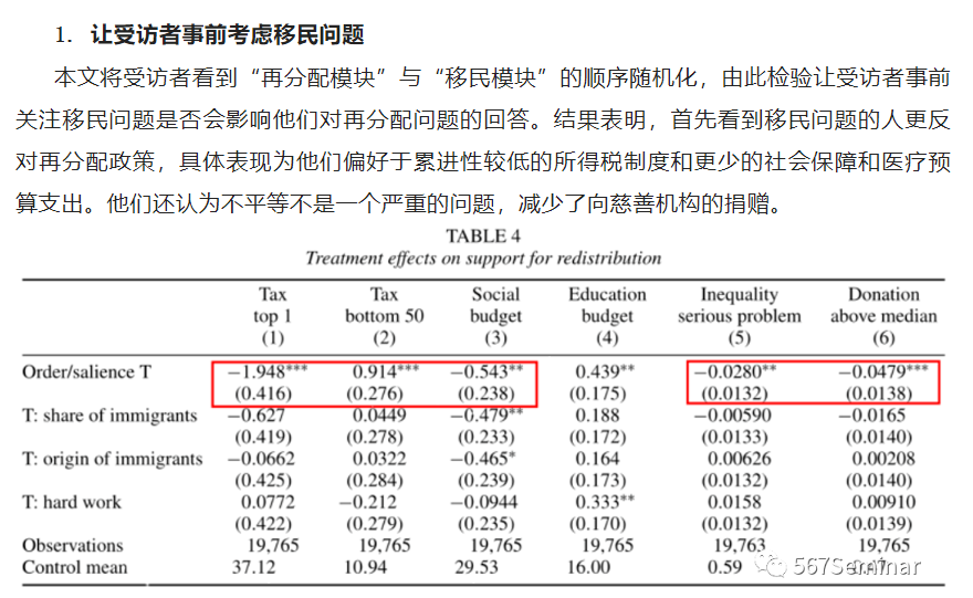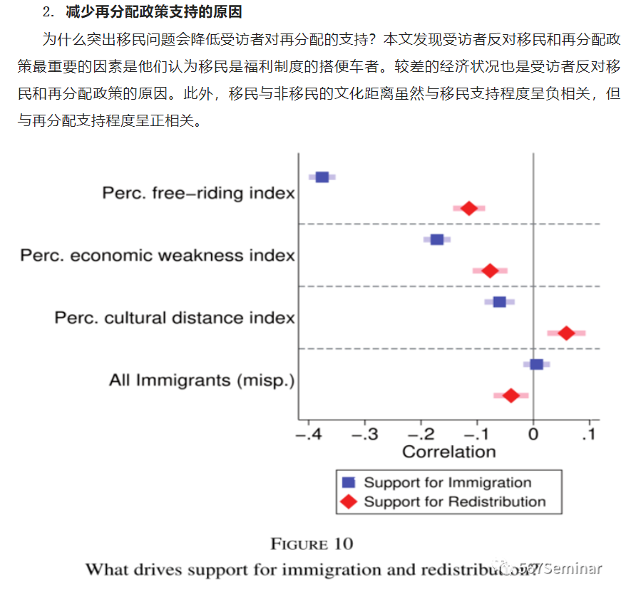 关于移民感知与再分配关系的研究发现,提前让受访者考虑移民问题会显著降低他们对再分配政策的支持力度,一个很重要的原因是受访者认为移民的受教育程度低、失业率和贫困率更高,因此更加依赖福利制度,存在“搭便车”行为,田野实验也证实了这一结论。