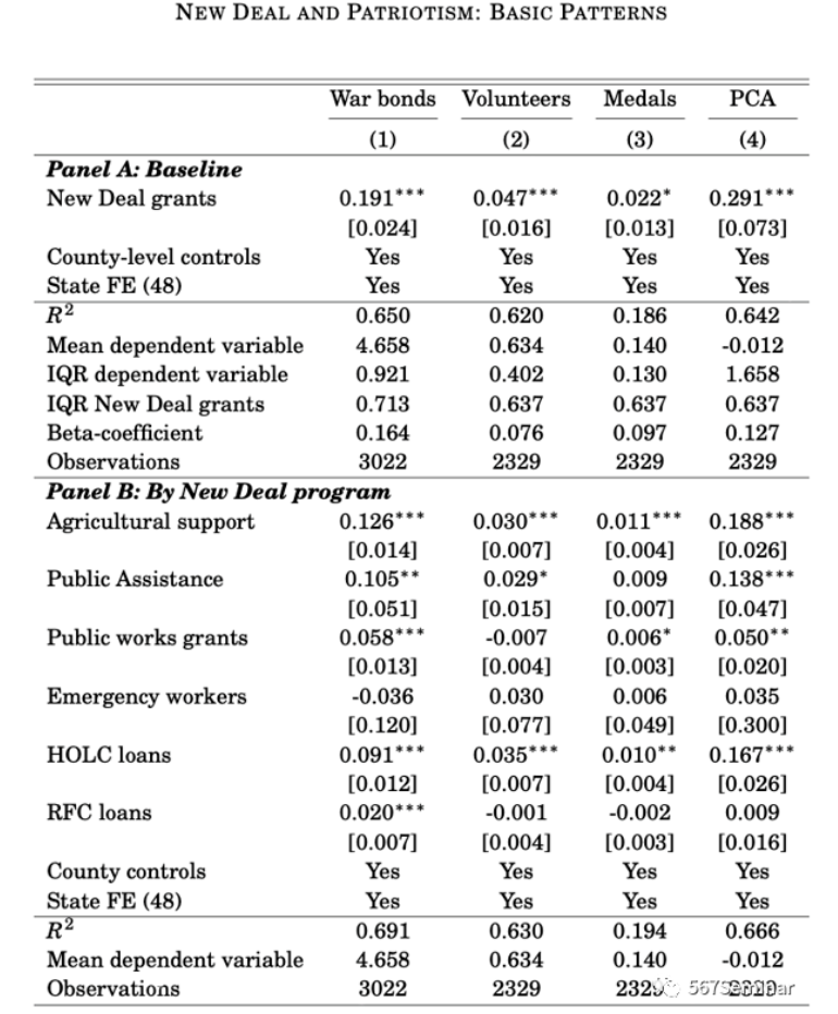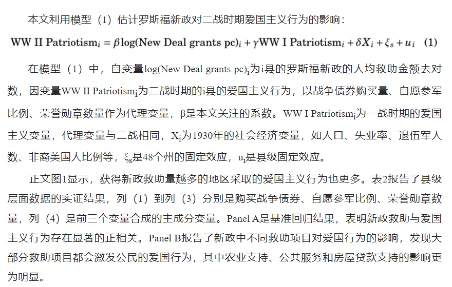 文献来源:Bruno Caprettini, Hans-Joachim Voth, New Deal, New Patriots: How 1930s Government Spending Boosted Patriotism During World War II,The Quarterly Journal of Economics, Volume 138, Issue 1, February 2023, Pages 465–513