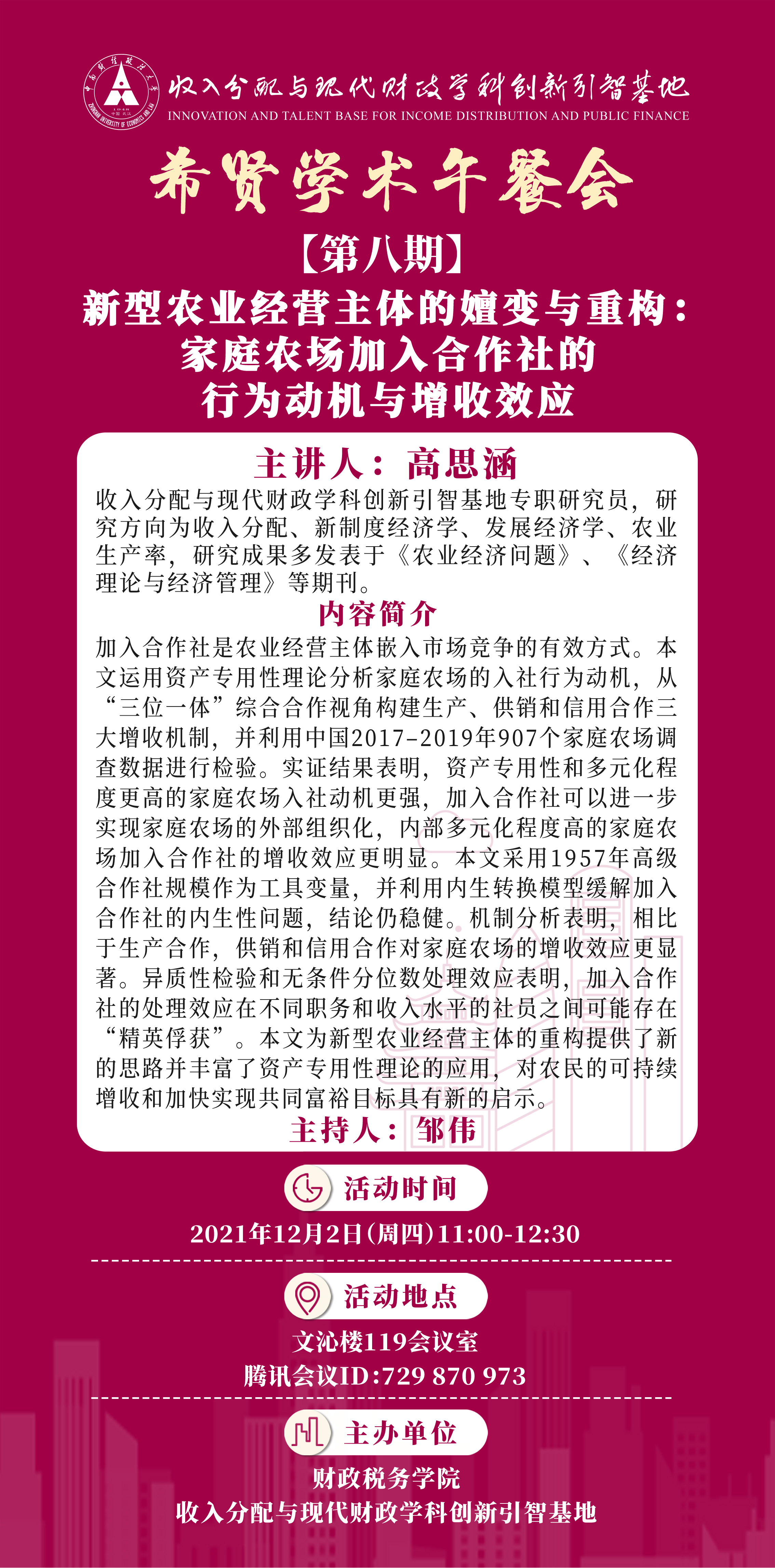 讲座题目: 新型农业经营主体的嬗变与重构:家庭农场加入合作社的行为动机与增收效应