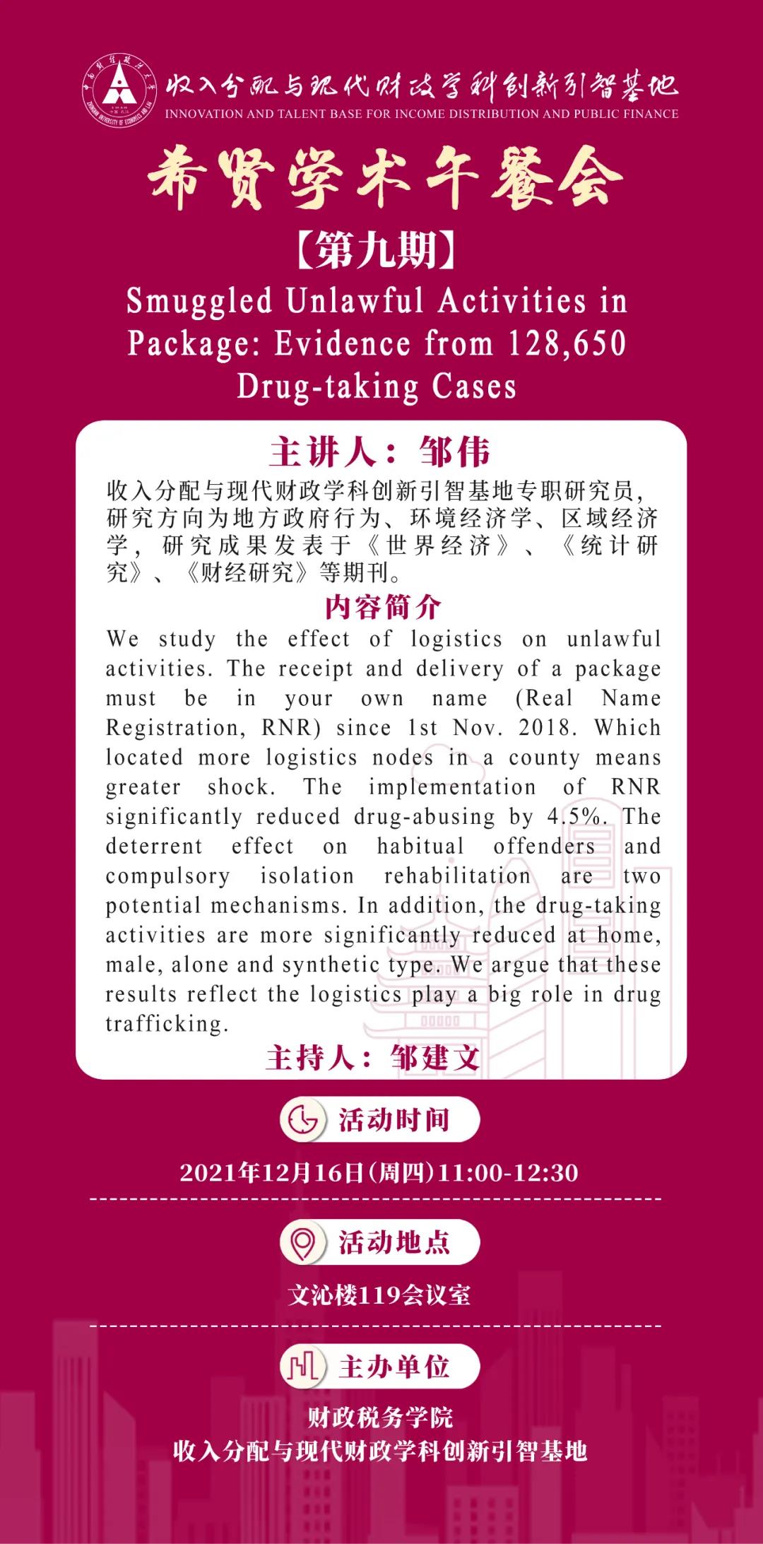 讲座题目: Smuggled Unlawful Activities in Package: Evidence from 128650 Drug-taking Cases