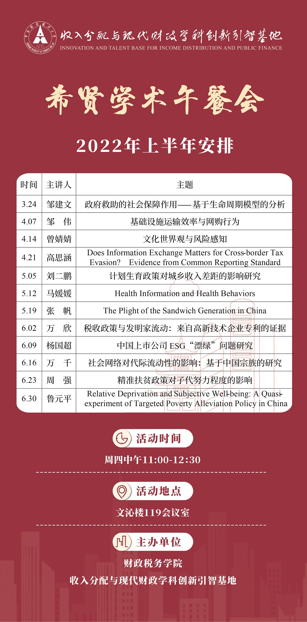 为了持续提升收入分配与现代财政创新引智基地的科研实力,营造浓厚的学术氛围,基地本学期将继续开展-希贤收入分配与现代财政学术午餐会-活动。2022年春季学期拟安排基地青年教师定期周四(中午11:00-12:30)开展一次工作论文研讨会,活动将于2022年3月24日正式启动。具体安排如下: