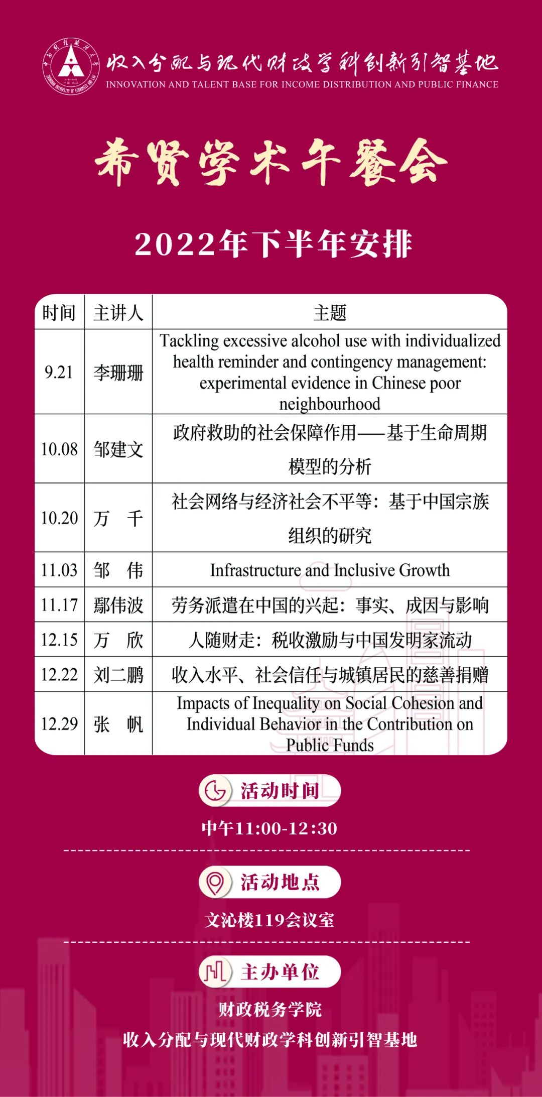 为了持续提升收入分配与现代财政创新引智基地的科研实力,营造浓厚的学术氛围,基地本学期将继续开展“希贤学术午餐会”活动。2022年秋季学期拟安排基地青年教师定期周四(中午11:00-12:30)开展一次工作论文研讨会,活动将于2022年9月21日正式启动。具体安排如下: