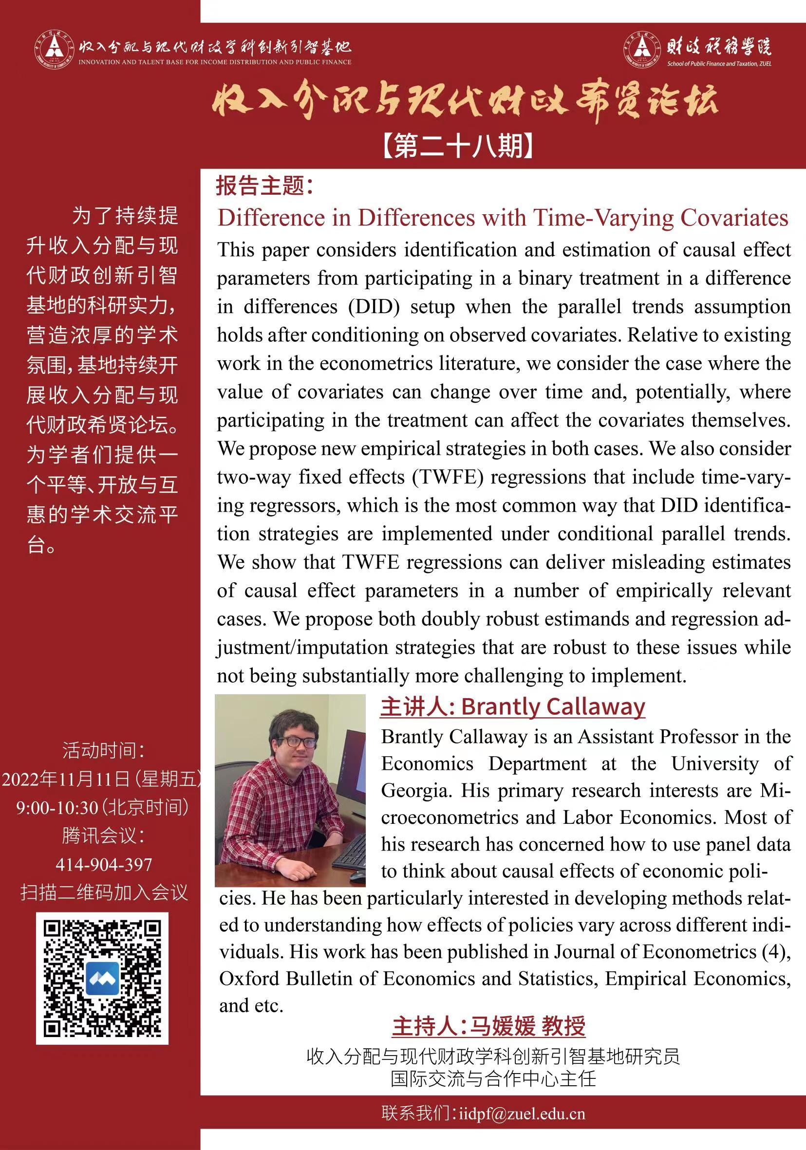 Brantly Callaway is an Assistant Professor in the Economics Department at the University of Georgia. His primary research interests are Microeconometrics and Labor Economics. Most of his research has concerned how to use panel data to think about causal effects of economic policies. He has been particularly interested in developing methods related to understanding how effects of policies vary across different individuals. His work has been published in Journal of Econometrics (4) Oxford Bulletin of Economics and Statistics Empirical Economics and etc.