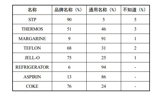 “现在,请您说说是品牌名称还是通用名称?”调查人员分别用STP,THERMOS ,MARGARINE,TEFLON ,JELL-O,REFRIGERATOR,ASPIRIN 和COKE 等8个单词进行测试,实验结果如下表: