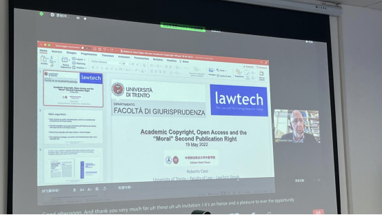 2022年5月19日下午,意大利特伦托大学的Roberto Caso副教授为知识产权学院、中意学院研究生开展主题为“学术版权、开放存取和的二次出版权”的讲座。知识产权中心主任助理徐小奔副教授和中意学院研究员、特伦托大学博士Gianmatteo Sabatino共同担任主持人。