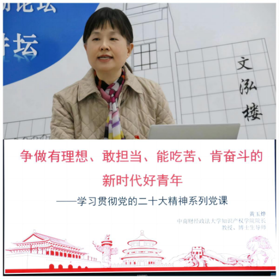 11月23日,黄玉烨教授将中国新时代发展要求同学生的成长规律相结合,从日常学习生活出发,向同学们分享了如何成为有理想、敢担当、能吃苦、肯奋斗的新时代好青年。她指出,知识产权法学是人文学科,同学们应提高沟通能力、写作与口头表达能力,培养解决各种问题的能力,同时广泛涉猎各类知识,形成广博的知识视野。