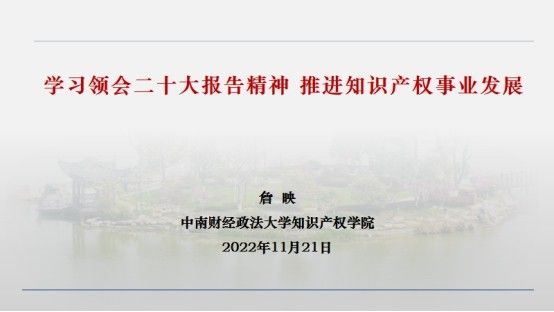 11月21日,詹映教授以“学习领会二十大报告,推进知识产权事业发展”为题展开讲授,介绍了中国式现代化建设的实践基础和理论指南,围绕马克思主义中国化时代化新境界重点讲解了坚持中国式现代化的核心内涵和本质要求,并就党的二十大报告中知识产权相关内容进行深入解读。