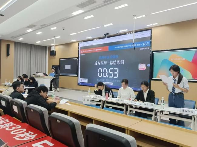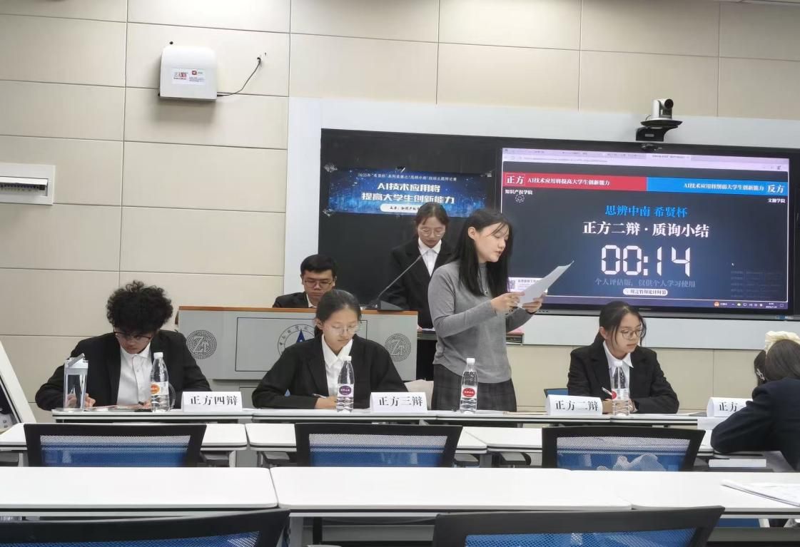本次小组赛我院处于C组“AI技术应用将提高/削弱大学生的创新能力”,需分别围绕正反方立场参赛。我院反方代表队于11月1日14:00迎战财政税务学院,正方代表队则于11月2日8:30迎战文澜学院。比赛设置立论与质询、双方四辩对辩、盘问与小结、自由辩论、总结陈词五个环节,每个环节都对辩手的临场反应能力、陈词表达能力提出了高要求。在比赛推进过程中,知识产权学院的辩手沉着应对,与对手激烈交锋,在筑牢自身论证框架的基础上,精准捕捉对手薄弱点展开攻防。正方代表队抓住对方“痛点”,用短交锋直击对方论证“削弱”的力度;反方代表队数据输出精准到位,将对手一步步引入己方的论证框架纠缠,让人印象深刻。
