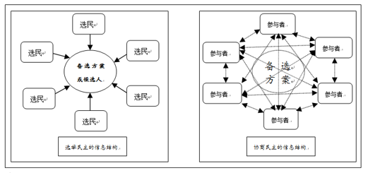 必须要注意的是,事物的功能决定了其所要采用的结构,但系统的结构也反过来决定着可能的功能。选举民主与协商民主不同的功能定位形成了不同的信息结构,而信息结构也决定了其功能及其实现程度。这里的信息结构是指信息运动的方向及其路线所形成的关系状况,包含了多个可见的维度,比如信息从哪里发出来,谁是信息的发布者,谁是信息的接受者,信息主体是如何互动的,信息互动的中心和边缘在哪里,谁对谁施加了(更多的)影响,信息的流量、密度及其增减情况如何等。信息的结构决定了信息处理的方式、信息沟通的状况以及定了信息处理的成本及其结果。