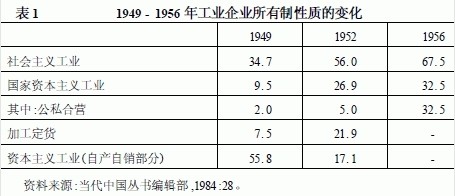 可以看出,1956年全部工业中三分之二为社会主义性质的国营和集体工业,三分之一为公私合营的国家资本主义工业。在公私合营的企业",私方"只有拿定息的权利,没有企业的经营权,这种企业实际上也是全民所有制的国有企业了。在商业领域,1956年的私营商业只占商业企业商品批发额度的011%,商业也全部完成了社会主义改造。