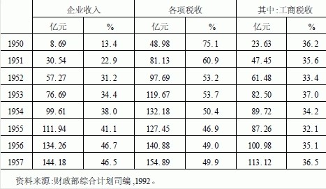 表2国家的财政收入结构变化(1950-1957)①[财政收入分三大项:"企业收入"、"各项税收"和"其他收入".其中"其他收入"占比重很小,表中没有列出]
