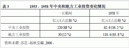 由于将绝大部分权力集中在中央,除了不利于调动地方的积极性,毛泽东主席还感到,中央政府内部的主流在强调平衡关系和发展速度的问题上,也存在保守的倾向。1955年12月27日,毛泽东主席在为《中国农村的社会主义高潮》一书所作的序言中指出,"现在的问题,还是右倾保守思想在许多方面作怪,使许多方面的工作不能适应客观情况的发展。现在的问题是经过努力本来可以做到的事情,却有很多人认为做不到。"(毛泽东,1956)1956年,在《论十大关系》的报告中,毛泽东主席又提出"要扩大一点地方的权力,给地方更多的独立性,让地方办更多的事情".1956年到1957年间,中央政府出台了一系列文件,①[这些文件包括1956年5月的《关于改进国家行政体制的决议(草案)》,1957年的《关于改进工业管理体制的规定(草案)》、《关于改进财政体制和划分中央和地方对财政管理权限的规定(草案)》、《关于改进商业管理体制的规定(草案)》]开始逐步、有计划地下放工业企业、商业和财政的管理权限给地方。这些政策是和加快经济发展的思路以及1957年的"反右"运动相呼应的。②[1957年的反右运动在一定程度上可以视为意识形态领域内的集权运动。从"百花齐放、百家争鸣"到几十万人被划为"右派",实际上也为大跃进期间的激进政策做了思想和舆论上的准备。这个方面不是本文讨论的重点,两者的关系以后将另文详论]自1957年下半年开始,毛泽东在多次会议上开始批评1956年的"反冒进"思想,1958年3月又提出了社会主义建设总路线的基本思路。
