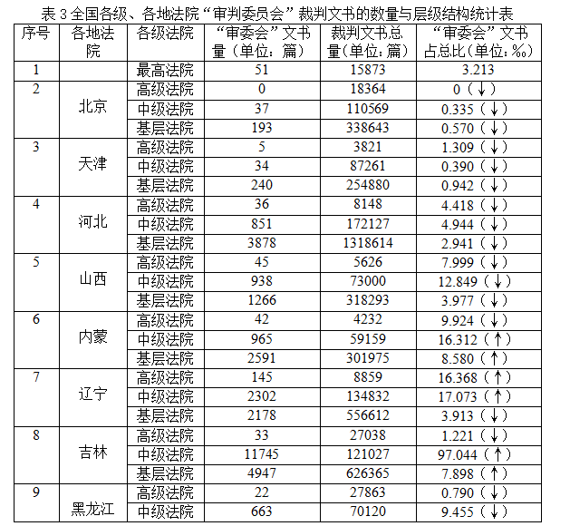就经验材料的处理需要说明的是:第一,对于裁判文书的数据统计,主要基于司法实践中这样一个前提性的认识,即凡是经过审判委员会讨论决定的案件,都会在裁判文书中出现“经本院审判委员会/审委会讨论决定”的字样。但也可能会出现文书写作上的“意外”,即案件经由审委会讨论决定但在文书中却未注明的情形。第二,由于数据较大且处于随时更新的动态之中,因而无法逐一核实,数据的准确性完全依赖“中国裁判文书网”的搜索引擎。第三,由于每个法院的裁判文书上网工作在进度和方式上存在不同,因而依据裁判文书的数量统计来反映各法院司法活动的情况,可能存在一定的不匹配性,尤其是一些统计数据显示为“0”的项目。这些其实都意在提醒,由于数据统计方法和样本法院的选取从根本上来说都是未经严谨的科学性论证的,因而这些实证性的调查结果既具“大数据”上的证明力诱惑,也同时隐藏着风险。这样,为了验证其中的一些发现,同时也为了降低部分结论性意见可能出现的偏差,我又对S省份外、其他地区的12个法院(同时包括高院、中院和基层院)30多位法官进行了个别访谈,以兹用法官们的切身感受来比对经由数据统计而得的发现。