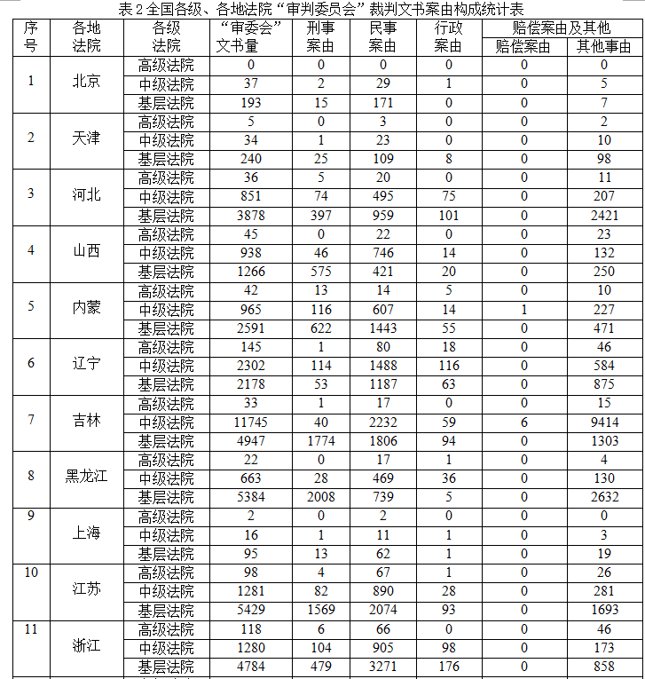 表2的数据统计来看:第一,就基层法院审判委员会讨论的案件事由构成而言,14个基层法院“民事案由”多于“刑事案由”,17个基层法院“刑事案由”多于“民事案由”;就中级法院和高级法院而言,“民事案由”多于“刑事案由”的同样都为30个,“刑事案由”多于“民事案由”同样也都只有1个。这意味着中级以上各法院的审判委员会主要关注“民事案由”,而基层法院暂时还并无规律可循。第二,就“刑事案由”与“民事案由”构成比例在各层级法院结构上的同步性以及其对应法院所在的区域而言,形成了一定的集中性。其中,14个地区的各层级法院审判委员会讨论的“民事案由”多于“刑事案由”,16个地区为基层法院讨论“刑事案由”多于“民事案由”而中、高级法院讨论“民事案由”多于“刑事案由”,1个地区为基层、中级法院讨论的“刑事案由”多于“民事案由”而高级法院讨论的“民事案由”多于“刑事案由”。这意味着,对于审判委员会制度实践而言,“案件类型”只在基层法院的运行中具有一定的区域性意义,而在整体上则与法院的层级结构更具紧密的关联性。——当然,这种意义影响力(14:16:1)的稳定性以及其与法院层级结构在整体上的关联性,还需要放置在一个更大的范围里来进一步验证。