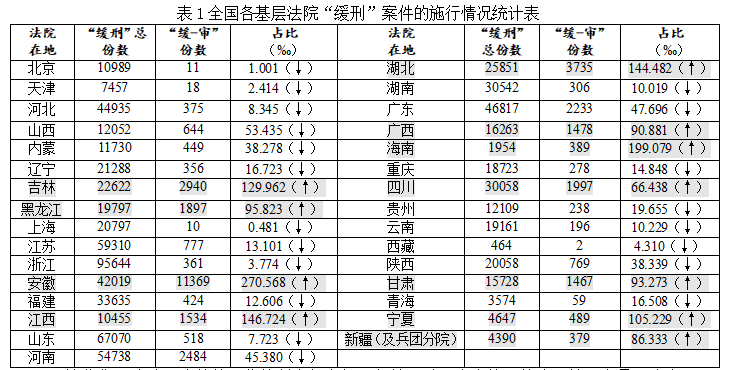 以“缓刑”案件为例来进一步证明这一点。尽管《实施意见》并未明确规定要将此类案件纳入基层法院审判委员会讨论的案件范围,也尽管从样本中的6个基层法院来看,有的明确进入到了审判委员会的工作规则之中(J1、J4、J6),有的却并未明确出现在规则里(J2、J3)或者未出现在规则的显著之处(J5),但从实际运行来看,“缓刑”案件在这6个基层法院都是需要经过审判委员会讨论决定的。然而,并不能够以此推断全国。因为从全国各基层法院的司法实践来看,我们发现,不仅并非所有的缓刑案件在基层法院都是一律需要经由审判委员会讨论决定的,而且各基层法院审判委员会对于缓刑案件的关注程度也大不相同。比如,表1的数据统计表明,审判委员会在“缓刑”案件中的出场频率,最高的大约为27%,最低的不到0.5‰,——最高的是最低的560多倍。与此同时,审判委员会在“缓刑”案件中的出场频率均值为57.860‰,其中18个法院在均值以下,13个法院则在均值以上。这种差异性的极大呈现,其实意味着在基层法院的司法实践中,哪些“缓刑”案件需要进入审判委员会讨论决定,哪些不需要,很多法院要么缺少明确的规定,要么有规定也不严格执行,相关的认定标准以及程序启动都较为随意。