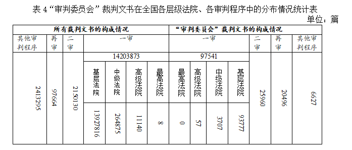 例如,表4的数据统计显示,经由“审判委员会”讨论决定的一审案件,在一审案件的总数中占6.87‰;而在审判委员会讨论决定的案件中,“一审”案件占到64.76%。这意味着将一审中原需提交审判委员会讨论决定的案件改由审判委员会委员合议庭审理,对于法院整体上的一审审判工作影响较小(即6.87‰);但却对审判委员会制度在一审案件处理过程中的“审理化”改造,影响较大(即64.76%)。与此同时,在基层法院一审的案件中,经由审判委员会讨论决定的案件占6.73‰;而在经由审判委员会讨论决定的“一审”案件中,基层法院的案件占到96.14%。这同样意味着,在基层法院一审案件中将原需提交审判委员会讨论决定的案件改由审判委员会委员合议庭审理,对基层法院整体上的一审审判工作影响较小(即6.73‰),但却对审判委员会制度在基层法院一审处理过程中的审理化改造,影响显著(即96.14%)。此外更重要的是,在中级法院、高级法院一审的案件中,经由审判委员会讨论决定的案件分别占其所处理一审案件的1.40%和0.51%,因而将原需审判委员会讨论的一审案件改由审判委员会委员合议庭处理,对于中级法院和高级法院的影响也相对较小。