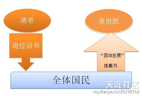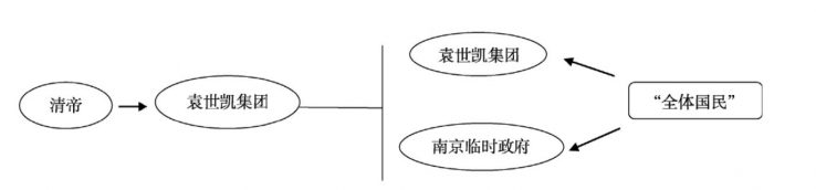 有学者指出,“全权组织临时政府”的内容是袁世凯自己在逊位诏书初稿基础上加进去的,并没有经过与南方的协商。不过,袁世凯这一私自添加行为的法律意义是什么,却没有专门讨论。在上文的分析中,有贺氏已将清帝逊位系列诏书解释为一个政治契约,契约双方分别是清王室(甲方)及全体国民(乙方)。但全体国民不可能作为一个整体来行动,必须通过自身的代表。这就涉及到甲方承认谁有代表权的问题。清帝逊位的一系列条件,系由清王室代表与南方民军代表商定,并由南京临时参议院通过,南方临时政府认为自己应该是清帝逊位诏书体现的政治契约乙方代表。然而从清帝逊位诏书来看,似乎是以委任的形式,将契约的乙方代表从南京临时政府改成了袁世凯政府。这就出现一个非常诡异的局面:下诏之前,袁世凯是甲方代表,而且是在诏书上以总理大臣的身份作了副署;下诏之后,袁世凯摇身一变,成为一个新生的临时共和政府首脑,成为这一政治契约的乙方代表。在不同的时间段,他既扮演了甲方代表,也扮演了乙方代表。这一政治契约的主体结构图示如下: