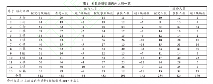 S县隶属于粤北Z市,截止2017年底,全县共辖10镇3街,辖区面积1560平方千米,常住人口51万人。2017年,该县完成地区生产总值160亿元,地方一般公共预算收入6.80亿元。S县的编制管理也遵循中央统一领导的原则,面临着刚性的制度约束。但我们在调研中发现,S县以一种“有编不用、编外扩编”的方式,突破了编制管理的刚性约束,形成了政府规模的“隐性扩张”。S县各乡镇编外用工由来已久。1985年,S县共建立19个乡镇,平均规模约82平方千米,平均人口不足3万,有5个乡的人口不足万人。最早从1988年底开始,S县按照中央的统一部署,开展了定职能、定机构、定编制的“三定”工作,初步确立起规范化的“编制”控制理念,一些“被精简”的人员没有了体制内的身份,但还留在乡镇政府“同工同酬”地工作,S县各乡镇最早的一批编外人员由此产生。“你问这一批有多少人,我还真说不清。那个时候还没有流行编内编外的说法”(访谈资料20180816G1)。