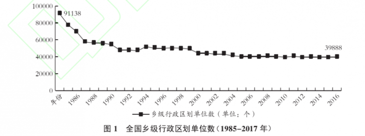 乡镇编制管理是乡镇机构改革的产物。1984年,全国各地依据中央《关于实行政社分开,建立乡政府的通知》(中发〔1983〕35号),建立起乡镇政府。1986年9月,中央发布《关于加强农村基层政权建设工作的通知》(中发〔1986〕22号),提出要对乡镇政府进行改革,并明确“改革的基本原则,是简政放权”。此后,乡镇政府开展了多轮改革,每次改革的着力点都不外乎机构精简和乡镇撤并,其结果是乡镇数量大幅度下降。截至2017年底,全国共有乡级行政区划单位39888个,相比1985年减少了56.2%(见图1)。