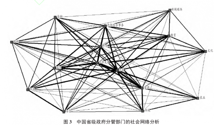 对其他省份的社会网络分析也得出了类似的结论,表明在副省长的分管方面,各省份之间有很强的趋同性。尽管分管型副职的设置需要因地制宜,去适应当地的经济社会发展状况和政治环境,但更为凸显的则是各省份之间的共同之处。图3将所有省份的分管部门网络合并在一起,由此获得全国的整体网。结果显示经济发展、民政、内部综合事务、科学、教育、资源等职能更有可能由共同的副职分管,而其他职能则专业性较强,一般分别由不同副职分管。一些职能之间的联系较为紧密,说明多数省份如此安排分管领导对应的职能,如政法和安全之间,资源、环境和农业之间。