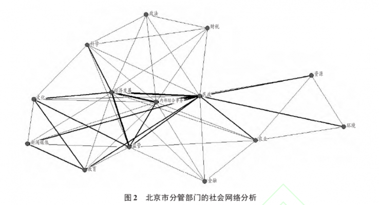 我们对副省长分管的部门总数和基于职能计算的HHI进行相关关系分析,结果显示管理幅度同职能多样性不存在显著相关关系(p>0.1)。换句话说,副省长分管的部门职能是否多样,同其所分管的部门数量并非紧密关联。这意味着一些副省长分管了许多毫不相干的职能,而这会分散其有限的注意力,并使其无法“术业有专攻”。 从副省长的情况来看,通常只有常务副省长是省委常委。样本中共有33位副省长是省委常委,占16.42%,即平均各省1-2位,一般为常务副省长和排名第二的副省长。T检验显示,常务副省长分管的部门数量平均为11.76个,而副省长平均分管6.81个部门,二者的差异在统计上显著(t=-8.44,p<0.01)。从分管的职能来看,常务副省长和副省长分别分管6.82个和3.82个职能,二者的差异在统计上显著(t=-10.76,p<0.01)。 从副省长的排序来看,位次越靠前,分管的部门和职能就越多。但是在排除常务副省长以后,其他副省长之间在分管的部门数量和职能数量方面不存在显著差异。比如,排序第2-6位的副省长均负责7个左右的部门,而只有排序在第8-9位的副省长负责少于5个部门。这可能是因为除常务副省长之外,其他副职领导通常按照提拔的时间或年龄来排序,彼此之间并没有政治差序关系。 样本中仅有10.45%的副省长是女性,且其同男性副省长在分管部门数量、分管职能数量方面,均不存在统计意义上的显著差异。由于研究期间是各省份政府换届不久,所以副省长的任期平均为1.22年,副省长的任期同其分管部门和职能的数量均无显著相关关系。 副省长的年龄与分管部门数量显著正相关(r=0.141,p<0.05),年龄越大的副省长,分管的部门数量越多,但是分管的职能数量却没有明显增多。比如58岁及以上的副省长分管9个以上的部门,而58岁以下的则一般分管6-7个部门。当然,这可能是由于年龄同副省长的排序是有关的,年龄越大的排序也越高(r=-0.244,p<0.01)。 从副省长的职业背景而言,我们将其分为四类:(1)其他省自下而上,如从其他省份的市长提拔为该省的副省长;(2)本省自下而上,如从省内擢升为副省长;(3)平调,即从其他省份的副省长转任该省;(4)京官,即来自中央部委。[26]来源最多的是本省自下而上提拔(68.66%),其次是京官(13.93%),再次是其他省自下而上擢升(13.43%),最后是平调(3.98%)。 研究显示,不同来源的副省长在分管部门数量和职能数量方面都不存在显著差异。只有平调的副省长平均分管10个部门,其他来源的副省长都分管约7个部门。本省自下而上提拔的副省长平均分管3个职能,而其他来源的则分管3-4个职能,特别是平调的副省长分管的更多(4.13个)。平调的副省长分管更多的部门和职能,这可能同他们丰富的分管阅历有很大关系,也可能是因为平调的副省长一般会分管非核心的业务,或者承担负有更多责任的部门。 (三)部门分管网络 哪些部门更有可能被同一副职分管 显然,职能相近的部门更有可能由同一副职分管,这样有利于专业对口。与此同时,如果职能的专业性较弱,那么也可以合在一起由副职分管。为此,我们利用UCINET软件进行社会网络分析,并使用NetDraw软件绘制社会网络图。[27]具体来说,我们将各个职能作为点,而将分管作为联结不同部门的关系。据此,我们考察哪些部门会有共同的分管领导,以及这些部门分管网络之间的边界。图中处于中心位置的部门并非最重要的,而是在分管网络中最经常同其他部门由共同副职分管的。 我们分别绘制了各省和全国的部门分管网络,如图2所示为北京市的情况。可以看到经济发展、内部综合事务、民政和监管方面的职能处于部门分管网络的核心,这意味着这些职能更有可能被组合在一起,由同一位副省长分管。这些职能的综合性较强而专业性较弱,所以可以由共同的副职分管。尽管食品、药品、质量等方面的监管被认为是专业职能,但是最近各级政府成立市场监督管理局,则意味着其专业性未得到重视。