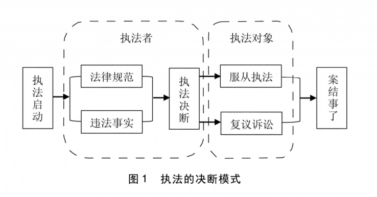 执法的实质是国家行政机关将体现在法律中的国家意志落实到社会生活之中,[26]这一过程始终伴随着国家权力的运作。执法者依靠国家权力对执法事务进行决断,构成了执法互动的预设模式。这一模式主要有以下特征:一是执法过程的强制性。执法以国家强制力为后盾,执法对象必须服从法律的执行过程与结果,如果有人挑战法律的效力和权威,就会面临国家权力的“规训与惩罚”;二是执法者的主导性。在具体的执法场景中,执法者对 执法事务拥有充分的裁决权,其认知和行动能够单方面地决定执法结果;三是执法流程的单向性。在执法活动中,执法对象需要服从执法者的裁决,认可国家权力塑造的社会关系和社会秩序,即使存在异议,一般情况下也只能进行法定的事后申诉。执法的决断模式具体如下页图1所示。