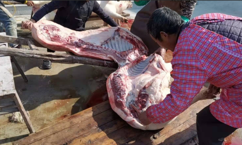 首先,农村对土猪肉的内部消化能力很强,以至于大部分家庭养殖的土猪,还没等走出农村就被吃掉了。我发现,和城市不同,许多老家农村的老百姓平时是不去菜市场或者商超买猪肉的。如果想要吃肉,杀一头自己养的土猪,或者在其他村民杀猪时买一点就可以了。这样不仅方便、便宜,猪肉的新鲜程度和味道也比外边卖的好。因此,现在每当村里有人杀猪,往往都会先通过微信群给邻里说一句,让他们来订肉。很多时候,猪都还没杀,肉就已经被预订干净了。杀猪时,也会有亲戚邻居来帮忙。杀完猪大家还会一起吃杀猪菜。而“订猪-杀猪-吃杀猪菜”的过程,也成为了一种不时发生的互助仪式。在这种情况下,如果下乡收土猪肉的经销商出价不够高,家庭养殖户也往往不愿意卖给他们:一来,相比和邻居做生意,和外人打交道更麻烦,怕被骗;二来,也少了一次和亲戚邻里互动互助、拉近关系的机会。这样,便有很大一部分家庭养殖的土猪肉没有机会流入城市市场。