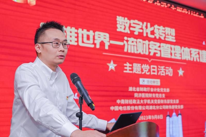 中国电信湖北分公司财务部部长石磊从两个方面进行分享。一是湖北电信财务部党支部概况,包括政治学习讲究精、党建统领站位高、调查研究服务深、基础党建抓的细、支部活动形式新等方面。二是财务数字化转型实践,构建智能前瞻的财务数智体系,以财务云平台为底座,提升财务管理、风险防控、服务支撑的工作效率、工作能力和工作质量。