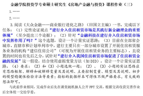 (通讯员 刘雨嫣)“房地产金融与投资”是米兰电竞·(中国区)投资学、房地产经济学和管理科学与工程(项目管理)等专业硕士研究生的一门专业课,为了让研究生们及时了解和学习有关房地产金融与投资方面最新的学术和实务动态,任课教师及时将中国建设银行董事长田国立主编的《大众金融——商业银行进化之路》(中信出版集团2023年8月出版)一书引入了2023-2024学年第一学期为二年级研究生开设的“房地产金融与投资”课程,任课教师除在课堂上介绍该新书的新观点新成果外,还赠送每位研究生一本该书,并通过课后作业的形式将该书作为必读文献实质性地引入课程学习(作业题目如图1)。