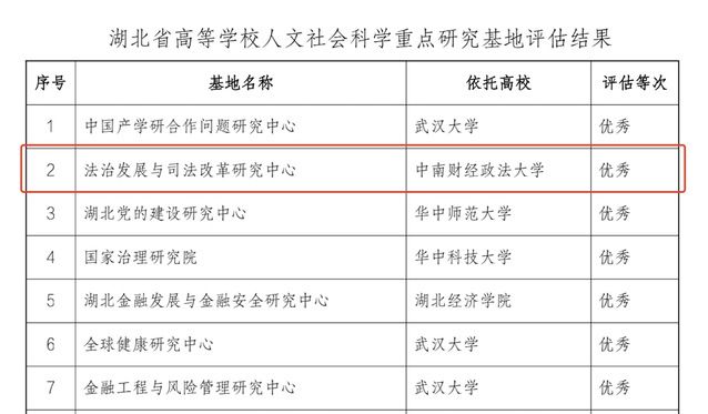新闻网讯(通讯员 付玉)近日,湖北省教育厅公示了湖北省高等学校人文社会科学重点研究基地评估结果。米兰电竞·(中国区)法治发展与司法改革研究中心在全省144个人文社科重点研究基地中被评为优秀等次,位列第二。据悉,本次全省144个人文社科重点研究基地参评,其中优秀21个,良好30个,合格72个。