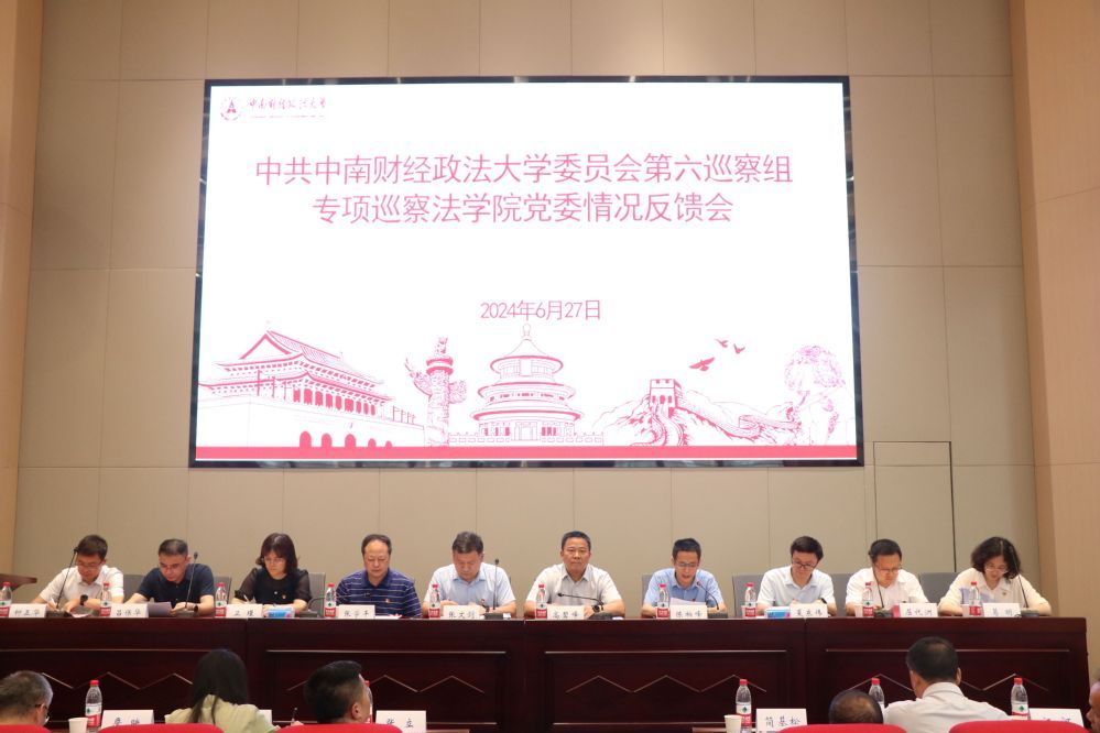按照校党委巡察工作统一部署,6月27日中午,学校第四届党委第一批巡察第六巡察组专项巡察法学院党委(含知识产权研究中心、知识产权学院、法律硕士教育中心、国家治理学院)情况反馈会议,在法科大楼一楼大报告厅召开。