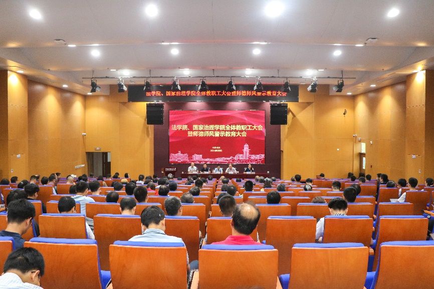 为弘扬教育家精神,加强教师思想政治工作,推动学院新学期工作平稳开局,9月5日下午,法学院、国家治理学院在文瀚楼报告厅召开教职工大会暨师德师风警示教育大会。法学院院长、国家治理学院院长陈柏峰,法学院党委书记张学平,法学院副院长张宝,法学院党委副书记李司铎、陈金川参加大会。张学平主持大会。
