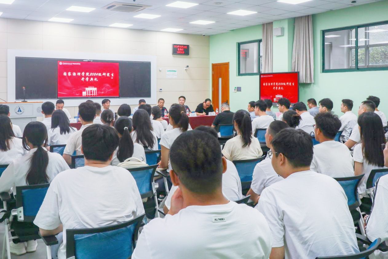 9月12日下午,国家治理学院2024级研究生开学典礼暨导师组见面会,在南湖校区文波智慧教室109隆重举行。国家治理学院院长陈柏峰教授,副院长陈实教授,各学科研究生导师代表栾永玉教授、徐汉明教授、童德华教授、段凡教授、李昊教授,学院部分专职教师,综合办公室主任李芳,研究生工作办公室主任吕瑞出席开学典礼。学院在校生代表和2024级研究生新生参加开学典礼。开学典礼由陈实主持。