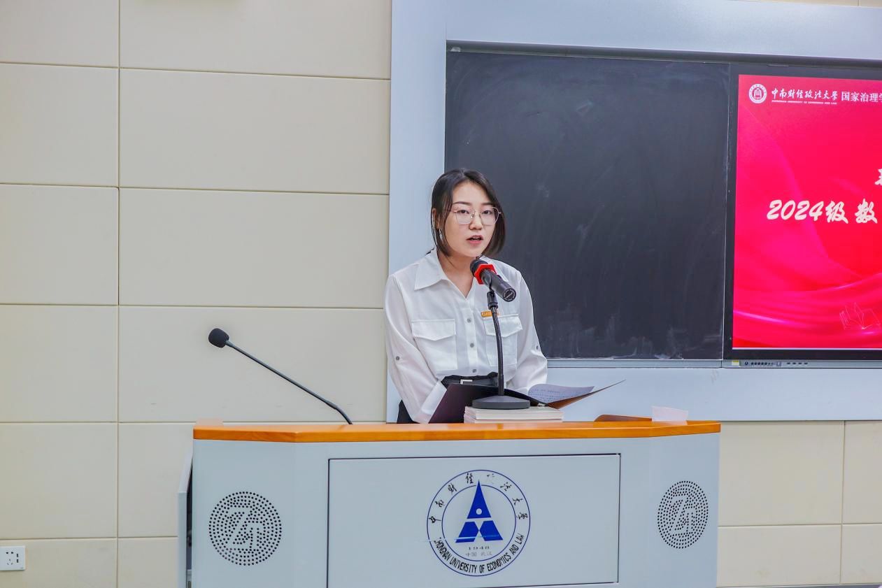 典礼仪式第四项,由学院2024级新生、数字法学专业硕士生鲜于阳同学发言。她代表新生向领导和老师们表达了崇高的敬意与真挚的感谢,回顾了自己本科阶段在中南大对法学专业的探索,并表达了坚定“做法治之光”的发展目标。她表示,在科技日新月异的今天,变化不可避免、不可躲藏,想要度过一段有意义的研究生生活,应当从三个方面进行努力:一是坚定信仰、明确目标,努力提升生命的高度;二是德法兼修、勤于实践,持续拓展生命的广度;三是脚踏实地、厚积薄发,不断积累生命的厚度。