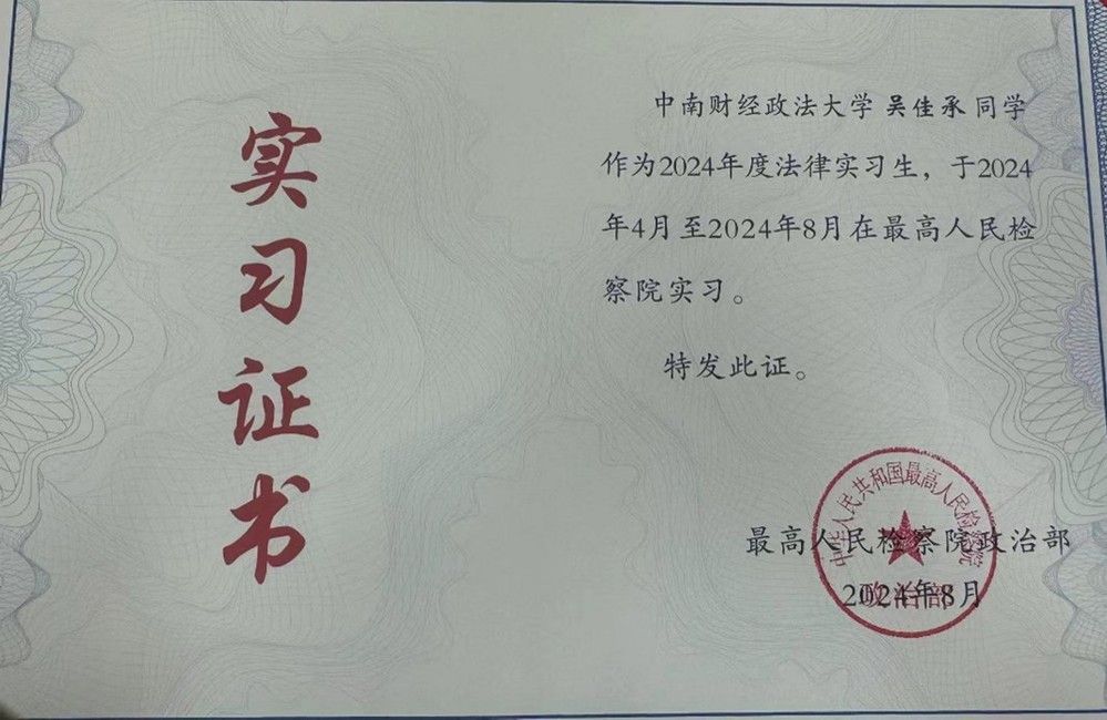 2024年8月,最高人民检察院2024年法律实习生项目顺利结束,我院2022级社会治理法学硕士研究生吴佳承于今年4月开始参与实习,圆满完成了为期5个月的实习任务。2024年初,为深入学习贯彻习近平新时代中国特色社会主义思想和习近平法治思想,全面贯彻党的二十大精神,深化法学教育和法治人才培育,加强检校人才培养机制衔接,最高人民检察院专门发布通知面向全国普通高等学校接收法律实习生,经学院推荐、学校选拔、最高人民检察院选拔等严格遴选,我院吴佳承同学顺利入选并分配至最高人民检察院第五检察厅实习,成为最高人民检察院首批招收的京外法律实习生。