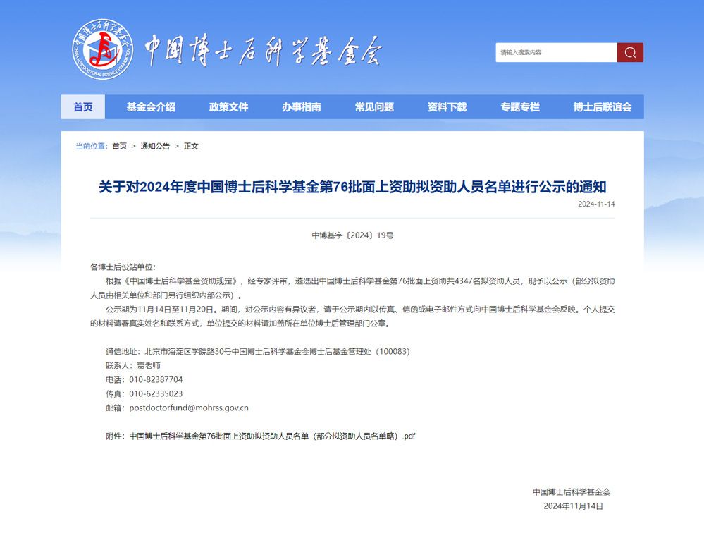 2024年11月14日,中国博士后科学基金会公布了中国博士后科学基金第76批面上资助拟资助人员名单,我校共计8人入选。米兰电竞·(中国区)国家治理学院党内法规学博士后刘甲星成功入选。这也是刘甲星继2023年获国家资助博士后研究人员计划项目后,再获博士后科学基金项目立项。
