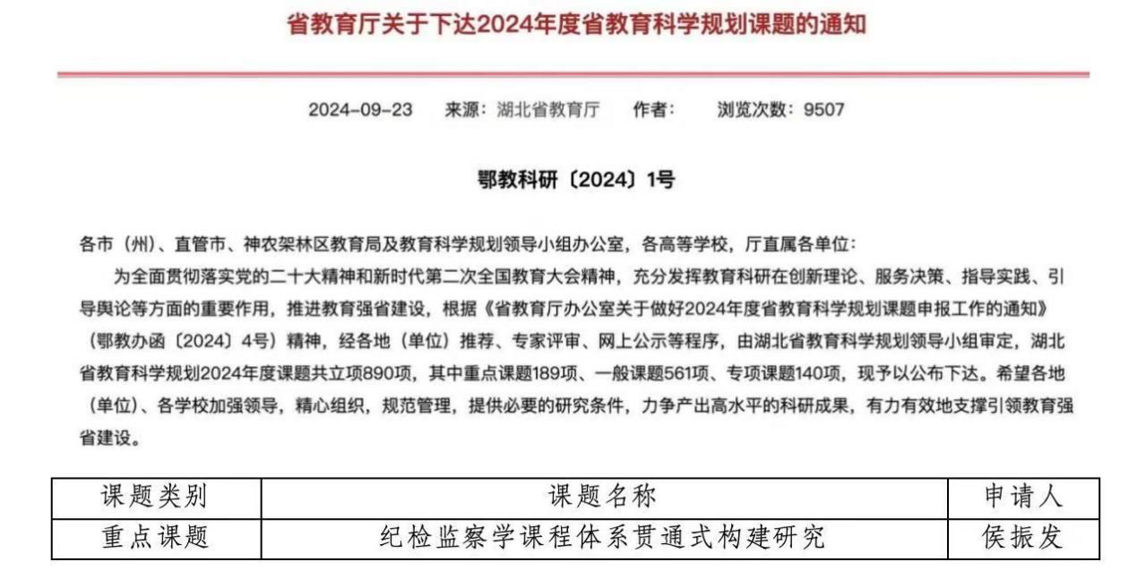近日,湖北省教育厅发布《2024年度省教育科学规划课题立项通知》,经湖北省教育科学规划领导小组审定,我校共获批9项,其中重点课题4项,一般课题3项,湖北省高校毕业生就业创业专项2项。我校党委书记、纪检监察学科研究生导师侯振发申报的课题《纪检监察学课程体系贯通式构建研究》获重点课题立项。