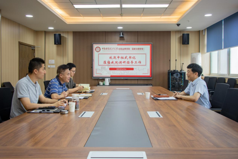 通讯员(舒雨诚)为深入开展高质量发展大研学活动,加强对新学院建设的指导帮助,5月14日上午,校党委副书记、纪委书记申祖武到纪检监察学院(国家治理学院)走访调研,与学院领导班子座谈交流,共同探讨推动学院学科高质量发展的思路和举措。院长童德华、副院长刘杨和研究生工作办公室主任吕瑞参加座谈会。