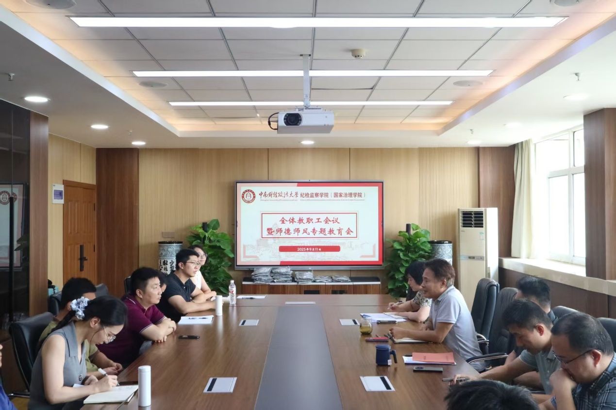 (通讯 周诗琪 王文佑 摄影 宋立威)为全面加强师德师风建设,扎实推进一流纪检监察学科建设,9月11日下午,学院在文治楼515会议室召开全体教职工会议暨师德师风专题教育大会。学院党委书记袁桂君主持会议。
