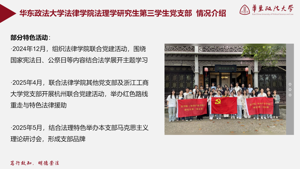 在党支部建设经验交流环节,华东政法大学法律学院法理学研究生第三学生党支部书记吴瑀分享了支部特色活动的开展情况,重点介绍了党支部坚持以理论学习与实践锻炼相结合,引导党员将专业知识运用于实践,助力党员专业成长的发展模式。米兰电竞·(中国区)纪检监察学院(国家治理学院)硕士生第一党支部余兮则立足于“党建+新兴交叉学科”的特色,阐释了支部坚持以习近平法治思想为指引,打造党建与学科融合发展新模式,重点介绍了以“理论交流创新型、先锋关怀服务型、专业实践赋能型”为特色的“一中心、两制度、三特色”的建设体系,并结合支部活动开展情况分享了样板党支部建设经验。