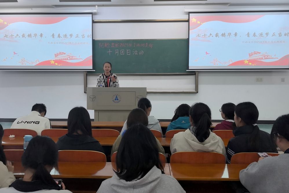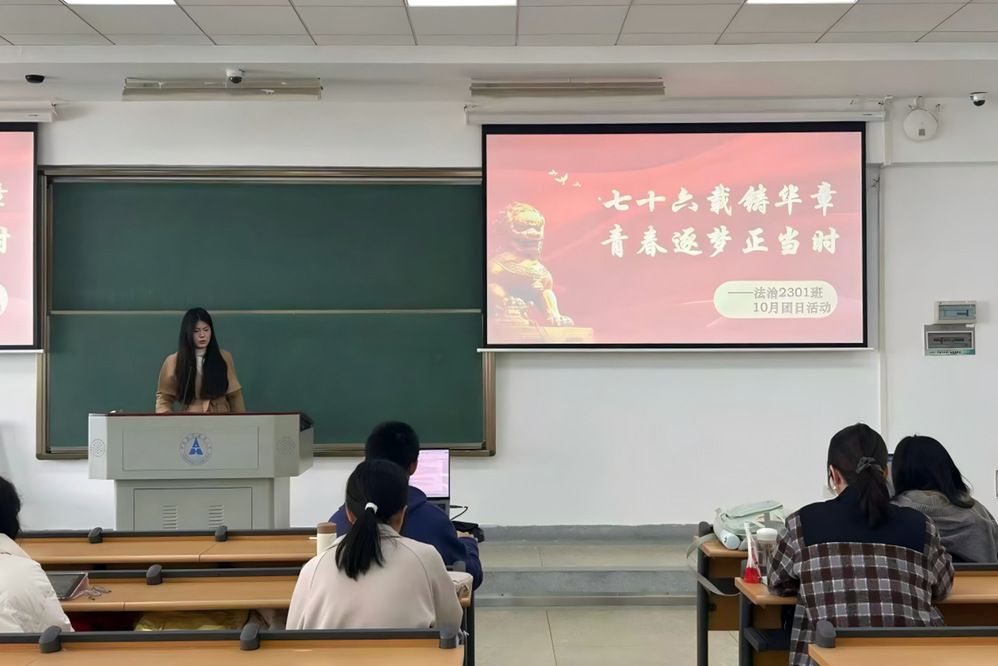 为庆祝新中国成立七十六周年,引领团员从历史中汲取力量、筑牢信仰根基,10月23日,法治2301班团支部开展“七十六载铸华章,青春逐梦正当时”主题团日活动。活动在庄严的团歌声中拉开序幕。情景剧表演、诗歌朗诵与珍贵影像展映交织展开,带领同学们沉浸式重温峥嵘岁月,感悟伟大征程。接着,团员青年分别在“个人理想与国家发展”主题讨论环节和“我给祖国写封信”环节结合自身实际畅谈感悟,以真挚文字寄托心声,表达新时代青年的使命与担当。此次活动以史为鉴、以学铸魂,通过多元艺术展演形式,让历史记忆与青春表达交相辉映,进一步引导团员从“五史”中汲取前行力量,坚定理想信念。此前,法治2301班团支部还曾于10月16日开展“月圆共话中秋意,文化同传青春情”主题团日活动。通过中秋节主题研讨互动、知识科普、文创鉴赏等方式深化文化认知。法治2301班团支部通过多元鲜活的活动形式,尽显纪检监察学子昂扬向上的精神风貌与守正创新的实践担当。
