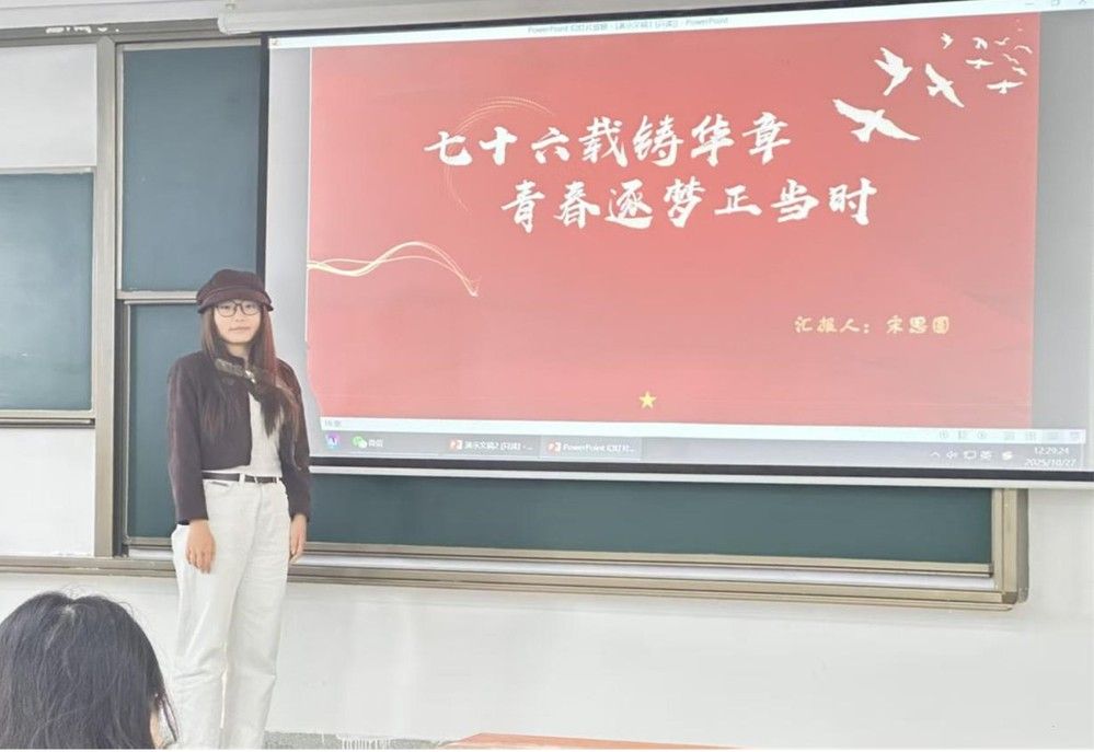 为庆祝新中国成立76周年、激发青年学生的爱国热情与使命担当,10月9日,纪检监察2401班团支部开展“七十六载铸华章,青春逐梦正当时”主题团日活动。活动以重温入团誓词开篇,团支书刘梦想带领同学们回顾新中国成立时刻与76载发展辉煌。随后,通过“五史”学习深化对“中国共产党的领导是中国发展的根本保证”的认知、坚定“四个自信”。最后,在“弘扬爱国精神”主题分享中,同学们一致表态要将爱国情怀转化为立足本职、钻研专业的行动,未来为纪检监察与国家治理贡献力量。本次主题团日活动不仅增强了班级凝聚力,更激发了同学们的爱国热情与奋斗精神。