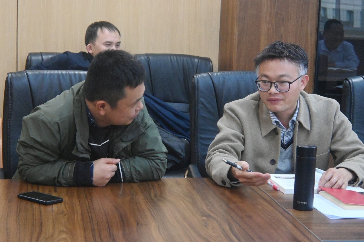 李雷副教授、缪国书副教授、孙逸啸老师翻看董少平教授携带的项目申报书范本。