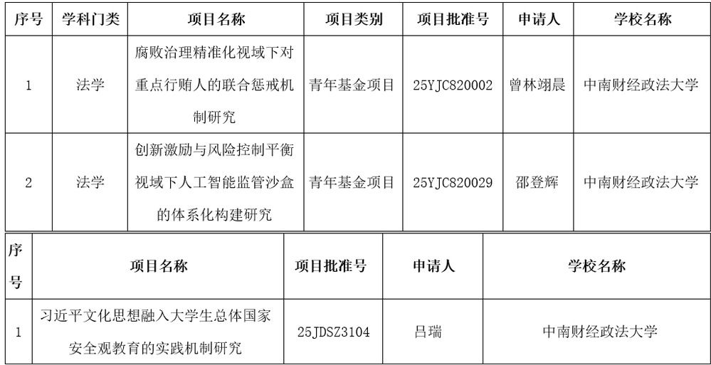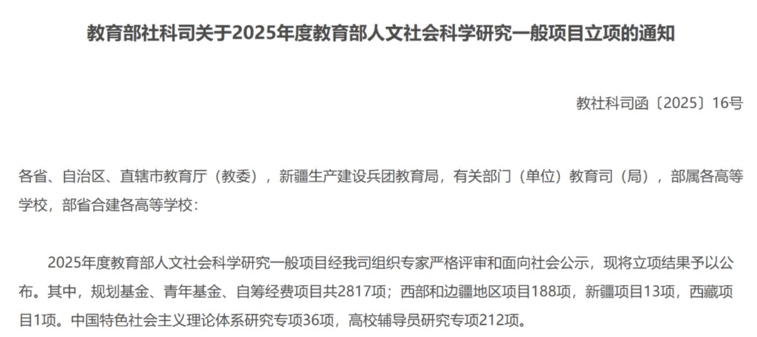 (通讯员 张争妍 邱学竟成)近日,2025年国家社会科学基金后期资助暨优秀博士学位论文出版、优秀学术著作再版项目立项名单公示,我院董少平教授申报项目“我国政治安全风险评价体系构建、测度及防控策略研究”拟获立项;同期,教育部社科司公布2025年度教育部人文社会科学研究一般项目立项结果,青年教师曾林翊晨、邵登辉分获青年基金项目立项,学办主任吕瑞申报课题斩获高校辅导员研究专项立项。