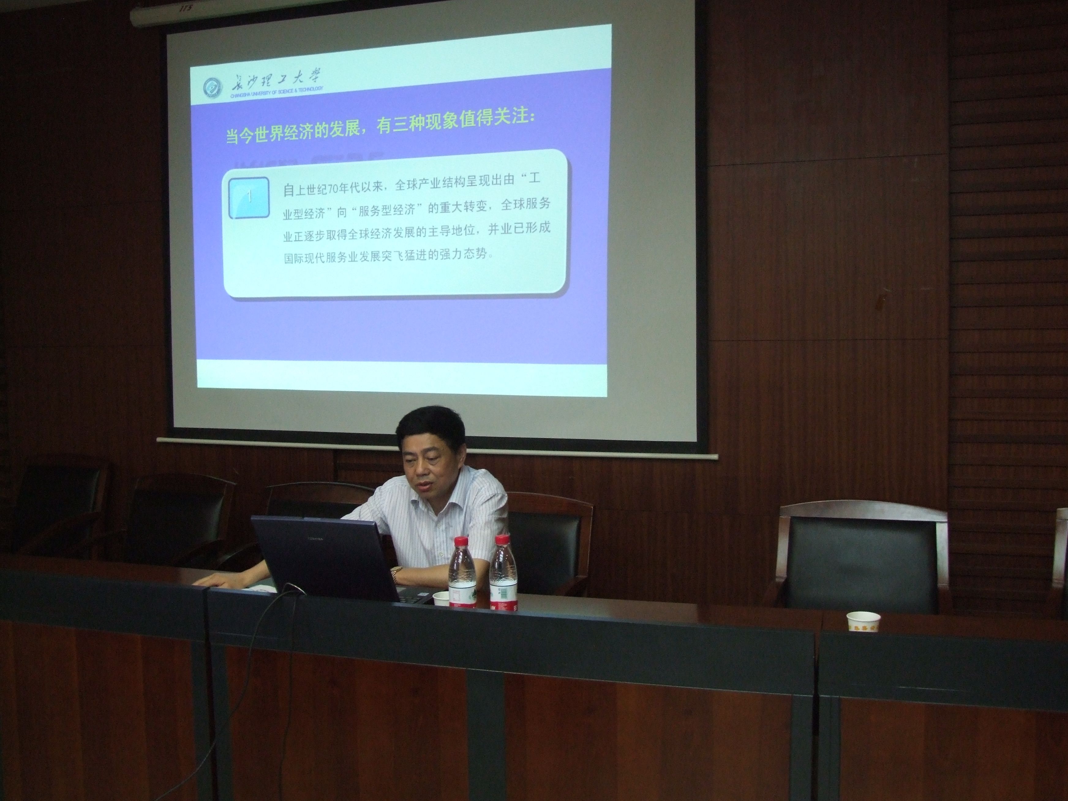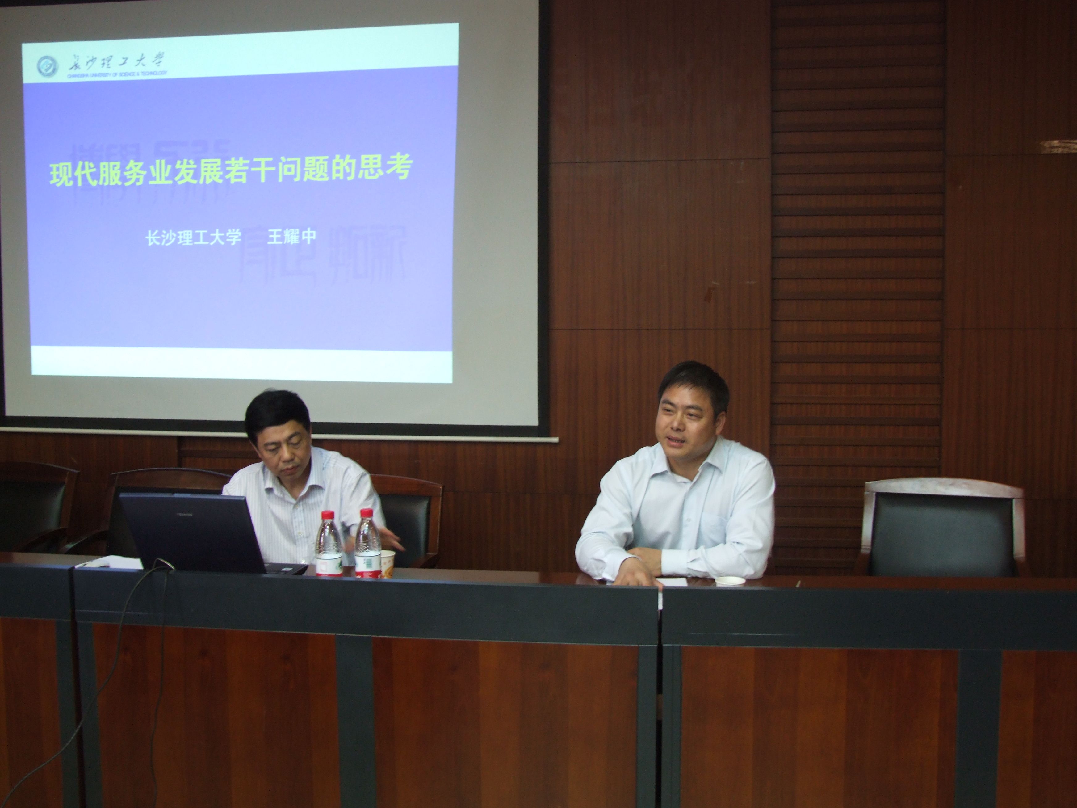 长沙理工大学党委书记王耀中教授来我校举办学术讲座 5月18日下午15:30,长沙理工大学党委书记、博士生导师王耀中教授在我校文泉楼二楼经济学院会议室,为我校师生作题为“现代服务业发展中的若干问题”的学术讲座。经济学院邹进文院长、陈银娥副院长、金融学院宋清华院长、唐文进副院长以及经济学院、金融学校部分师生认真聆听了王教授的精彩讲座。此次讲座由经济学院和金融学院共同举办,讲座由金融学院宋清华院长主持,宋院长在讲座开始前向大家介绍王耀中教授的基本情况。