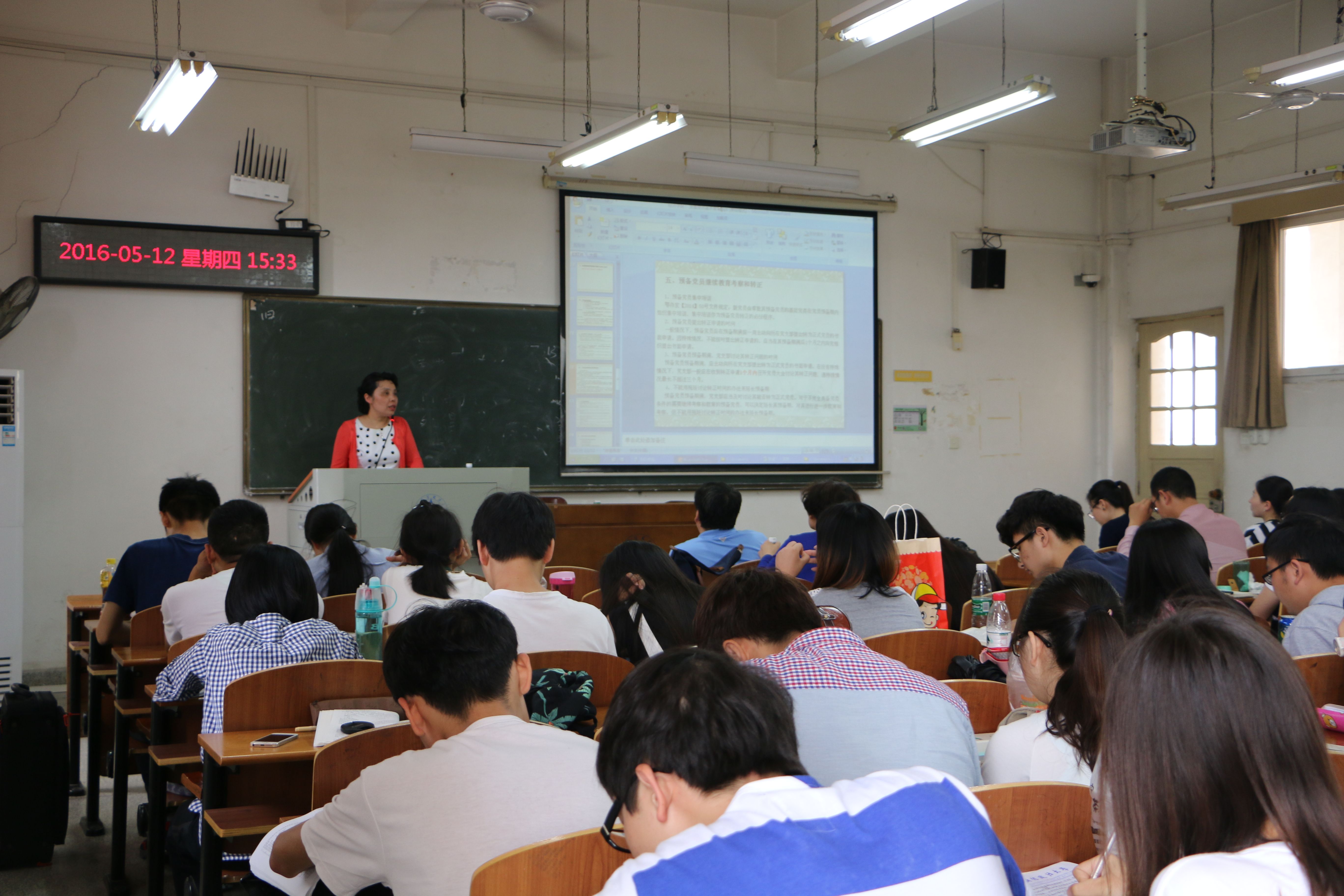 (新闻与网络技术部 单俊俊 王洁)2015年5月12日,经济学院入党培训讲座在文澜楼308教室展开。校团委组织部组织员李明老师受邀作为本次讲座的主讲人,经济学院学生工作办公室主任孟庆红老师、经济学院组织员罗慧敏老师、研究生辅导员向克强老师、2013级辅导员聂飒老师、2015级辅导员岳明泽和康俊老师出席本次讲座。讲座以发展党员工作的基本要求为主题,概括了发展党员工作程序、发展党员工作注意事项及其他问题,旨在消除经济学院入党积极分子对于入党程序及细则的疑惑,积极发展优秀学生党员。 下午两点,讲座正式拉开帷幕。李明老师首先指出入党培训是基层党建工作的重要工作,是培养中国特色社会主义的重要途径,发展学生党员与我们每个人息息相关。在介绍发展党员的工作程序时,李明老师谈到新形势下发展党员工作的总要求是:按照“控制总量、优化结构、提高质量、发挥作用”的总要求,严格发展党员工作,提高发展党员质量。要达到从严治党的要求,必须做到四个“严格”,即严格标准、严格培养、严格程序、严格责任。接下来李明老师向我们介绍了详细的党员发展流程,这一流程包括入党申请人、入党积极分子、发展对象、预备党员和正式党员等四个阶段。老师结合入党积极分子培养、考察登记表的具体内容以及自己入党的切身经历深入浅出地为广大学子分析了各阶段的注意事项,重点突出,同学们受益匪浅。