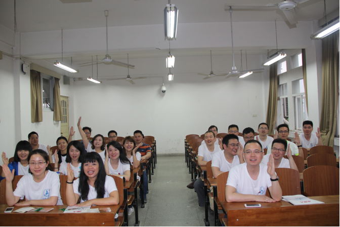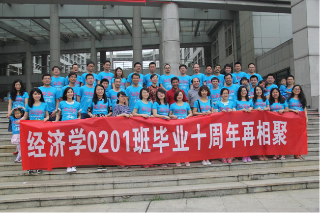 随后,曾任2002级辅导员张霞老师发表讲话,她用两个词概括了自己的心情:感动和感谢。十年重聚,她感动于浓浓的师生情谊、同学友情;感谢于大家无论过去如何当下如何,仍旧没有忘记母校和老师。最后张老师送给大家三个数字:“211”,第一个数字是希望大家两条腿走路,家庭和事业或许并不完美,但都要兼顾缺一不可;第二个数字代表着一个好身体,身体是革命的本钱,无论如何给自己一个健康的身体;第三个数字代表着一个好心态,人生百态,活出自己就是精彩。活动最后,大家一起合影留念,纪念他们的第一个十年,他们相信,今后会有第二个、第三个和许许多多的十年。 2002级国民经济管理校友的十周年班会同样精彩纷呈。他们坐在曾经共同上课的教室里,在十四年以后又一次进行自我介绍:“大家好,我叫……我来自……我现在在……这十年我……”。仿佛时间从未流逝,但又改变了很多。